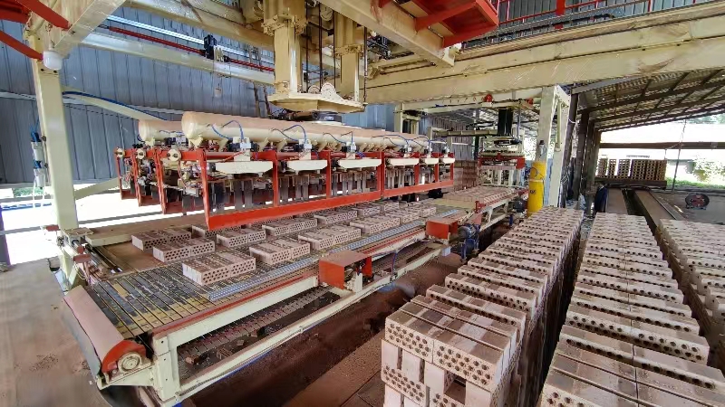 The“JuXiang” fully automatic brick unloading and baling machine is based on thesemi-automatic baler, which has carried out technological innovation and isequipped with an automatic brick unloading system. The system adopts theprinciple of the company's automatic setting machine and consists of lifting,translation and rotation actions. The fixture of the brick unloading machinepicks up the bricks from the kiln cart and divides them into one grab ormultiple grab of the entire layer. After the translation action, it is placedon the assembly table, and then the baling system completes the grouping,palletizing, baling, and finally the forklift forks up for transportation to complete the entire brickunloading and baling process.